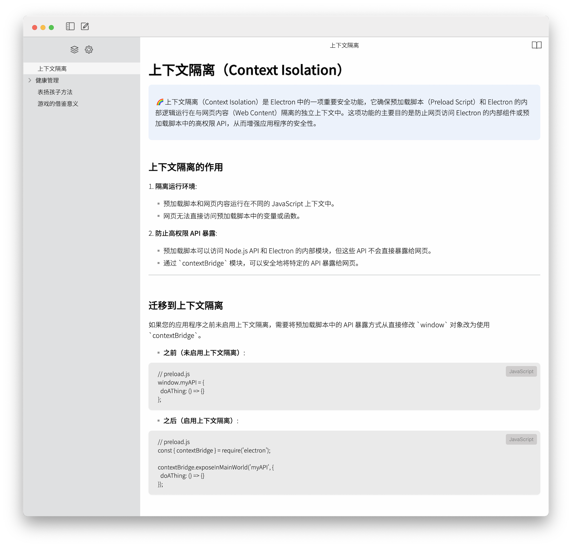 如果您的应用程序之前未启用上下文隔离,需要将预加载脚本中的 API 暴露方式从直接修改 `window` 对象改为使用 `contextBridge`。
